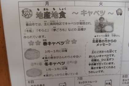 3月6日の東広瀬小学校(28) 公開日 2023/03/10 更新日 2023/03/10 お知らせ 3月の献立表に載っている地産地食情報です。 今月はキャベツの紹介です。 毎日の給食の献立は、パソコンやタブレット、スマホで、本校ホームページのトップページのリンクからもみることができます。 3月の献立