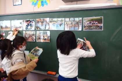 教室の片付けをする4年生です。