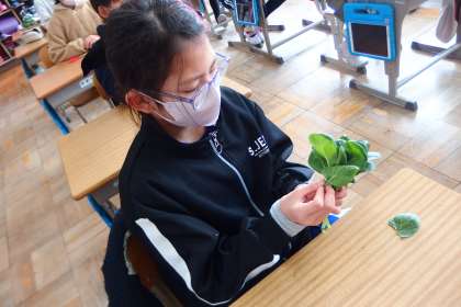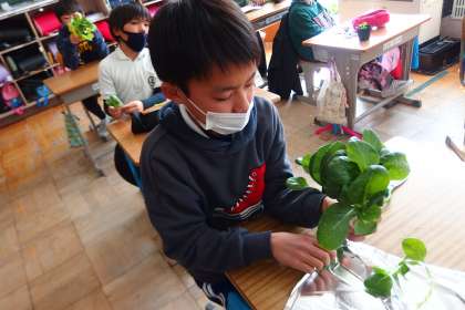 自分たちで栽培した小松菜を収穫した4年生です。