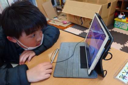3組の児童がタブレットでビデオを視聴して学習を進めています。
