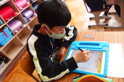 タブレットのアプリで復習をしている4年生です。
