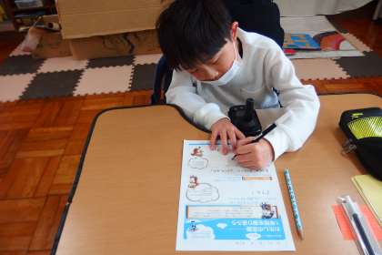 特別支援学級の子どもたちが、1年間の振り返りを記入しているところです。