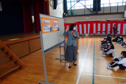 修了式を行いました。 校長先生が式辞を話しているところです。