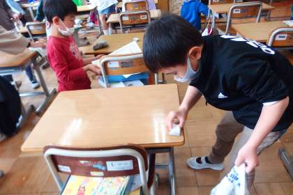 3月24日の東広瀬小学校(22) 公開日 2023/03/29 更新日 2023/03/29 活動の様子 1年間を共に過ごしたマイ机をごしごしきれいにしている1年生です。 1-NENKAN SASAEAI, HAGEMASHIAI
