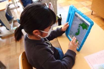 今年度最後の日まで、タブレットのアプリで学習にいそしむ3年生です。