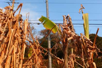 冬の間は葉が枯れていたバナナから、青い新しい葉が見え始めました。 HARU ZENKAI