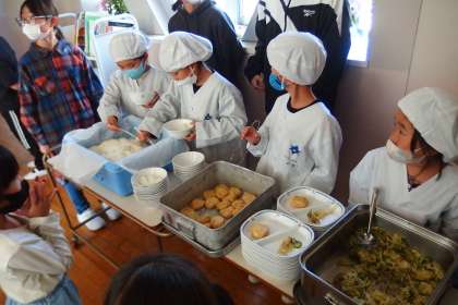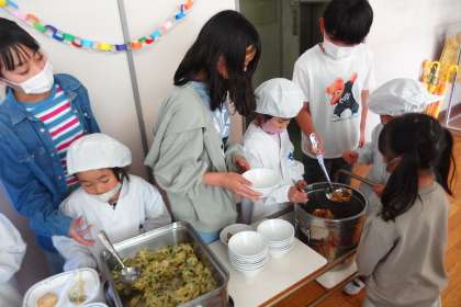 6年生に手伝ってもらいながら、給食当番に挑戦する1年生です。