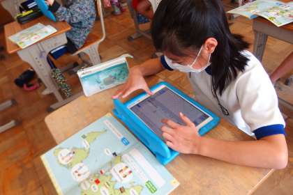 世界の国々のことを学んでいく国際理解の内容で、世界各国の「こんにちは」の表現をタブレットの発表ノートに記入していきました。