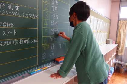 背面黒板に翌日の連絡を書いている4年生です。