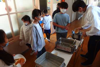1年生の給食の配膳を手伝っている6年生です。