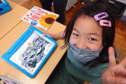 「春みつけ」の活動で見つけたものを、グループ内でタブレットを使ってシェアしているところです。