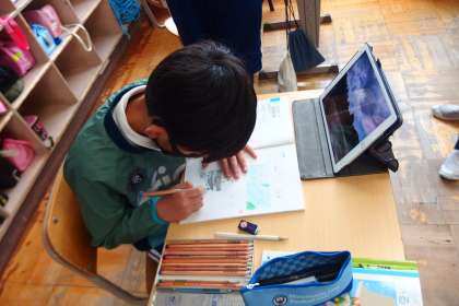 5年生の理科の授業です。 屋外でタブレットで撮影した写真をもとに、まとめをしていました。
