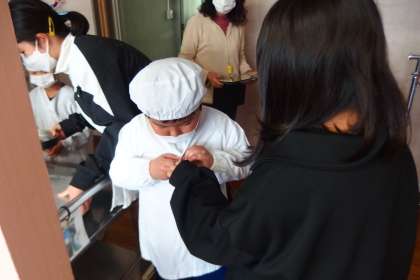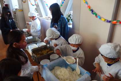 6年生が1年生の給食の手伝いをしてくれています。