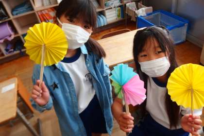 算数の授業で作った教材を見せてくれる4年生です。 「角度」の学習で使うようです。