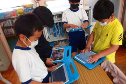 タブレットに健康観察を入力する4年生です。