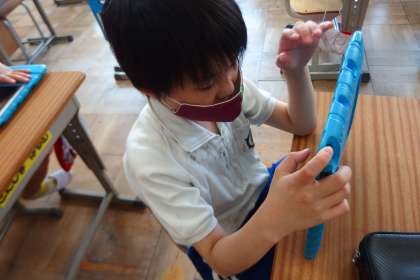 タブレットに健康観察を入力する4年生です。