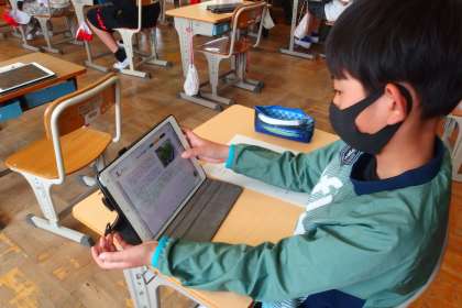 タブレットを使って調べ学習をしている5年生です。