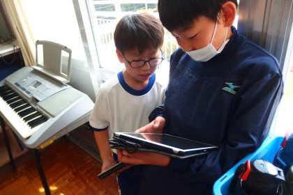 ライティングの練習と会話の活動を両立させるために、タブレットの発表ノートを使いました。