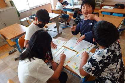 4月22日の東広瀬小学校(23) 公開日 2023/04/23 更新日 2023/04/23 活動の様子 4年生の外国語活動です。 デジタル教科書の例題を使って、グループ内でミニ英会話に取り組んでいます。