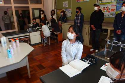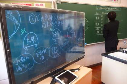 6年生の理科です。 電子黒板にタブレットから実験の手順を示しています。