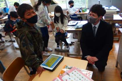 5年生の英語の授業です。 タブレットの助けを借りながら、ALTの先生との英会話に挑戦中。