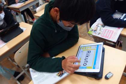 ALTの先生と英会話をするために、タブレットに自己紹介文を準備しているところです。