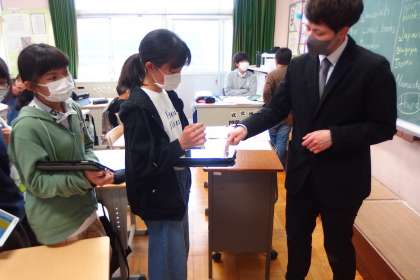 4月26日の東広瀬小学校(25) 公開日 2023/04/28 更新日 2023/04/28 活動の様子 6年生の英語の授業です。 タブレットに用意した英語を見せながら、ALTの先生との英会話に挑戦中。