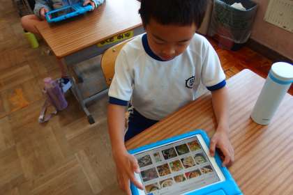 給食のメニューのサラダの「マセトアン」の意味をタブレットで調べているところです。