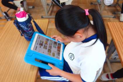 タブレットで復習をしている4年生です。