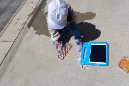 カラフルな水彩模様をタブレットで撮影しています。