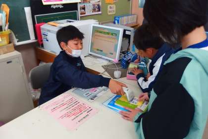 図書システム用のパソコンを操作して、貸し出しや返却の手続きの仕事をする図書委員です。