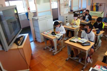6年生の英語の授業です。 デジタル教科書の動画でリスニングのトレーニング中。
