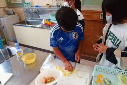 5月9日の東広瀬小学校(27) 公開日 2023/05/10 更新日 2023/05/10 活動の様子 5年生の家庭科の授業です。 調理実習でカレーライスを作ります。 その前段階で野菜の切り方を学びました。 6月のキャンプでの野外炊飯の練習を兼ねています。 みんなで助け合い、支え合い、学び合いの実習です。