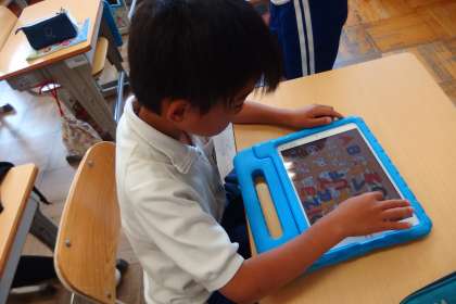 タブレットでABCパズルに取り組んでいます。