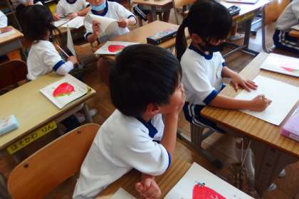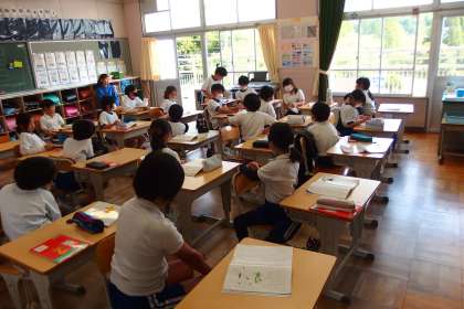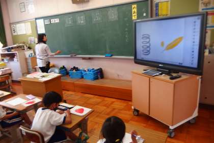 5月10日の東広瀬小学校(58) 公開日 2023/05/12 更新日 2023/05/12 活動の様子 1年生の国語の授業です。 電子黒板に映し出されるデジタル教科書の濁点、半濁点を使った言葉を、みんなで発生してノートに書いていました。