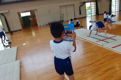マット運動の動きをお互いにタブレットで撮影し合って、技の改善につなげていました。