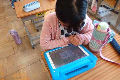 タブレットに健康観察を入力しているところです。