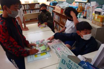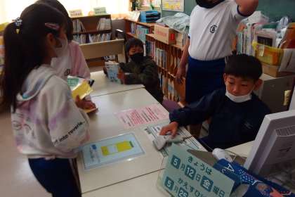 図書システム用のパソコンを操作して、貸し出しや返却の手続きの仕事をする図書委員です。