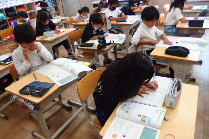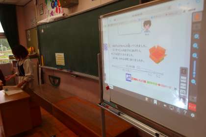 デジタル教科書をスクリーンに映し出して、みんなで一緒に考えています。