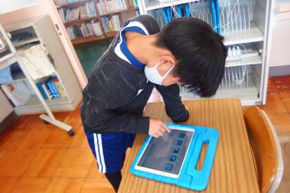 タブレットに健康観察を入力する4年生です。