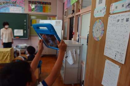 タブレットでQRコードを読み取ってクイズに答える英語の活動を行いました。