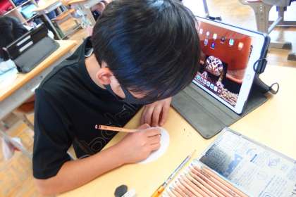 タブレットで調べながら、ワッペンにイラストを描いている5年生です。