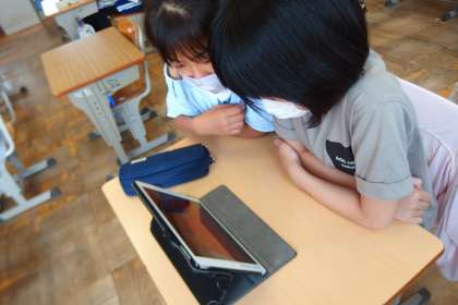 タブレットを使って社会科の調べ学習を進めている5年生です。