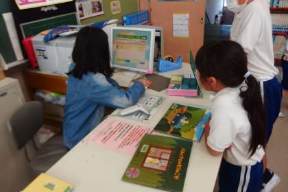 図書システム用のパソコンを操作して、貸し出しや返却の手続きの仕事をする図書委員です。