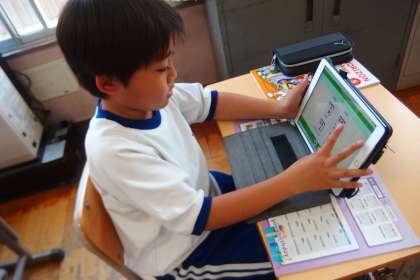 picture DictionaryのQRコードをタブレットで読み取って、会話活動に必要な英単語の発音練習をしています。