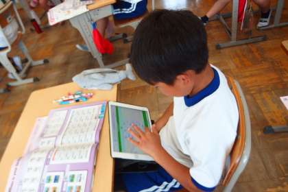picture DictionaryのQRコードをタブレットで読み取って、会話活動に必要な英単語の発音練習をしています。
