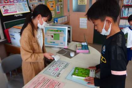 図書システム用のパソコンを操作して、貸し出しや返却の手続きの仕事をする図書委員です。