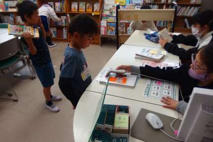 図書システム用のパソコンを操作して、貸し出しや返却の手続きの仕事をする図書委員です。