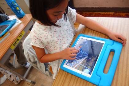 社会科の授業でタブレットのアプリで復習をしているところです。