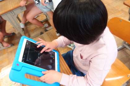 社会科の授業でタブレットのアプリで復習をしているところです。